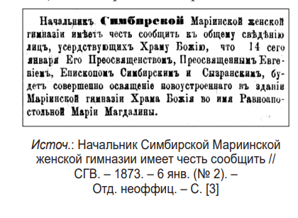 9. Начальник Симбирской Мариинской женской гимназии имеет честь сообщить к общемусведению лиц, усердствующих Храму Божию, что 14 сего января Его Преосвященством, Преосвященным Евгением, Епископом Симбирским и Сызранским, будет совершено освящениеновоустроеннаго в здании Мариинской гимназии Храма Божия во имя Равноапостольной МарииМагдалины // СГВ. – 1873. – 6 янв. (№ 2). – Отд. неоффиц. – С. [3].