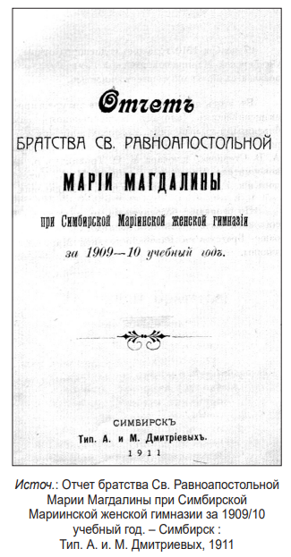 4. Отчет братства Св. Равноапостольной Марии Магдалины при Симбирской Мариинскойженской гимназии за 1909/10 учебный год. – Симбирск : Тип. А. и М. Дмитриевых, 1911. – 17 с.