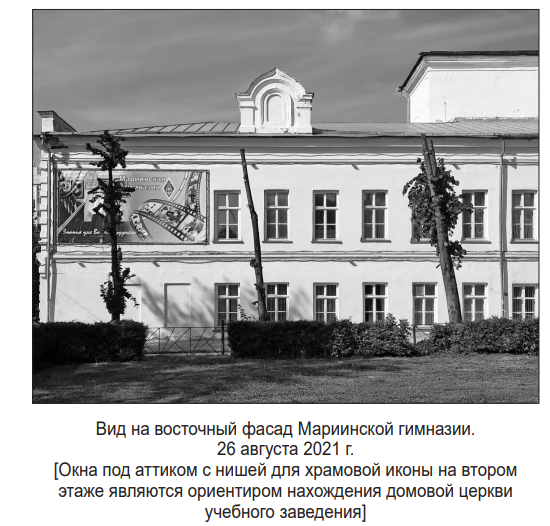 - (5) «Копии с оригиналов написаны им для церкви Марии Магдалины в Иерусалиме» (источ.: III. Справочник-путеводитель по г. Симбирску : II. Церковный отдел // Справочная книжка и адрес-календарь Симбирской губернии на 1916 год / изд. Симбир. ГСК; под ред. секр. ком. – Симбирск : Губ. типо-литогр., 1916. – С. CVI).Так в тексте. И подобная формулировка может ввести читателей в заблуждение. В действительности русский художник, академик и адъюнкт-профессор Академии художеств, профессор исторической живописи Михаил Николаевич Васильев (1830–1900) написал образы святых для храма Святой Марии Магдалины в Гефсиманском саду Иерусалима. В иконостасе же Мариинской гимназии находились копии, сделанные им же.