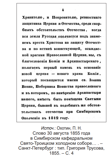 - см.: Охотин, П. Н. Слово 30 августа 1855 года в Симбирском кафедральном Свято-Троицком холодном соборе, в день св. благоверного князя Александра Невского и тезоименитства благочестивейшего государя императора Александра Николаевича, при закладке к Симбирскому теплому Николаевскому собору колокольни с церковью во имя св. Иоанна воина для помещения в ней иконостаса и прочей святыни, принадлежащей церкви, бывшей при Симбирском ополчении в 1812 году, сказанное симбирским кафедральным протоиереем Павлом Охотиным. – СанктПетербург : Тип. Григория Трусова, 1855. – С. 4.