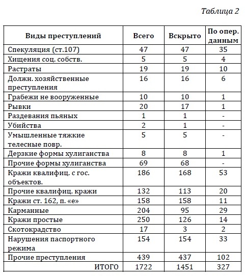 На практике же теоретические выкладки сплошь и рядом вступали в конфликт с криминальной действительностью. Что в очередной раз и показали итоги оперативно‐служебной деятельности городского отдела милиции за 9 месяцев 1942 г., которые были подведены в октябре. Основные ее показатели приведены в таблице 2.