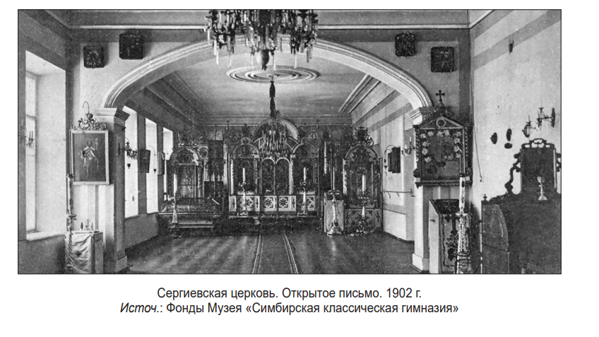 12. Устройство гимназического храма // Агринский, А. С. Симбирская гимназия (1809–1909 г.) :ист. записка / сост. преп. А. С. Агринский. – Симбирск : Типо-лит. А. Т. Токарева, 1909. – С. 65–66.