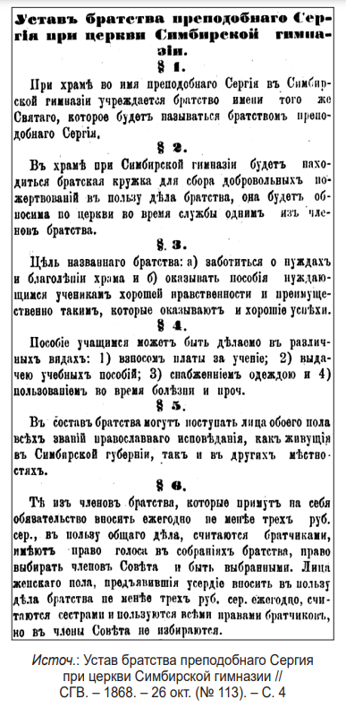 - см.: Устав братства преподобнаго Сергия при церкви Симбирской гимназии // СГВ. – 1868. – 26 окт.(№ 113). – С. 4.