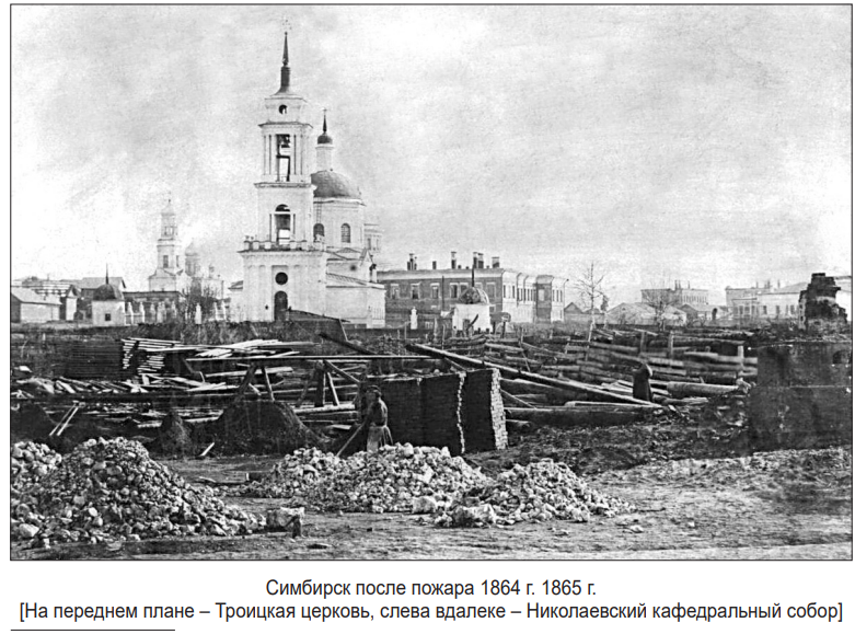 Троицкая церковь не слишком сильно пострадала во время катастрофической девятидневной серии пожаров, бушевавших в г. Симбирскес 13 по 21 августа [с 25 августа по 2 сентября] 1864 г.: в самом храме «с северо-западной стороны, сгорела рама, переплеты ея были вышиблены бурею и упали внутрь церкви на чугунный пол: прогорел тольконебольшой кружок в ковре на амвоне» (14).