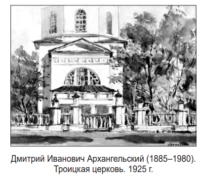 - Такой облик Троицкой церкви запечатлён на некоторых раскрашенных дореволюционных открыткахи акварелях художника-графика и пейзажиста Дмитрия Ивановича Архангельского (1885–1980).