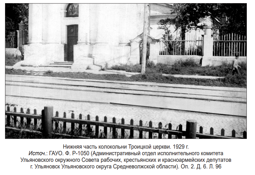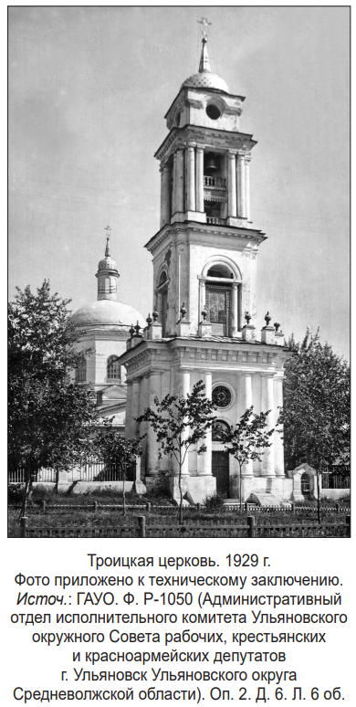 - см.: Заключение технической комиссии по вопросу о колокольне Троицкой церкви // ГАУО. Ф. Р-1050(Административный отдел исполнительного комитета Ульяновского окружного Совета рабочих, крестьянскихи красноармейских депутатов г. Ульяновск Ульяновского округа Средневолжской области). Оп. 2. Д. 6. Л. 93.