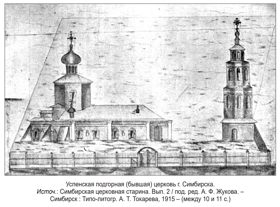 - «Нынешним летом (1865 г. – В. Я.) приступили к сломке одного из старинных Симбирских храмов, Единоверческой Успенской церкви, построенной еще до учреждения в Симбирске города». Источ.: Успенская подгорная церковь // СГВ. – 1865. – 17 июля (№ 28). – С. 4.