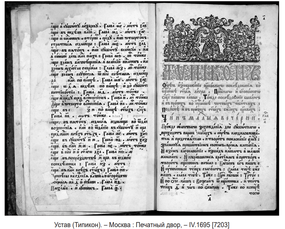 - см.: Устав (Типикон). – Москва : Печатный двор, IV.1695 [7203]. – Тит. л., 1–4, 1–675=681 л.