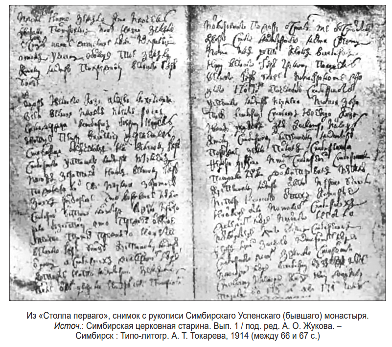 - 1 см.: 1) «В 1853 году штат Успенской церкви по малолюдству прихожан ея, закрыт; прихожане присоединены к Петропавловской и Смоленской церквам, а самая церковь отдана старообрядцам…» (источ.:[Невоструев, К. И.] Сведения о бывшем Симбирском Успенском монастыре // Симбирский сборник. Т. 2 / подред. В. А. Ауновскаго. – Симбирск : Тип. Губ. правл., 1870. – С. 59); 2) «В 1853 году приход этой церкви уничтожен и она отдана старообрядцам, присоединившимся к православной церкви на правах единоверия…»(источ.: Мартынов, П. Л. Город Симбирск за 250 лет его существования : сист. сб. ист. сведений о г. Симбирске. – Симбирск : Типо-литогр. А. Т. Токарева, 1898. – С. 144). Однако в некоторых источниках такжевстречаются и 1854 г., и 1866 г. Что касается 1854 г., то действительно имеется информация о том, что «Благословенная грамота дана единоверцам Симбирским епископом Феодотием 31 октября 1854 г.» (источ.: Соловьёв, А. И. Упраздненные монастыри и пустыни Симбирской епархии. – Симбирск : Типо-лит. А. Т. Токарева,1909 (на обложке – 1910). – С. 104–105). А относительно 1866 г. (см., например: Баженов, Н. Статистическоеописание соборов, монастырей, приходских и домовых церквей Симбирской епархии по данным 1900 года :с прил. геогр. карты Симбир. епархии. – Симбирск : Типо-лит. А. Т. Токарева, 1903. – С. 14), то, скорее всего,автор путает год передачи здания храма единоверцам и год собственно его «переноса» на новое место.
