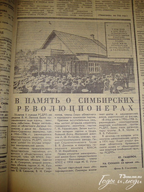 (…) Вчера неподалеку от областного Дворца пионеров у дома по бывшему Мало-Садовому переулку, где в 1904 – 1906 гг. размещалась конспиративная квартира симбирской группы РСДРП, состоялся митинг по случаю открытия мемориальной доски.