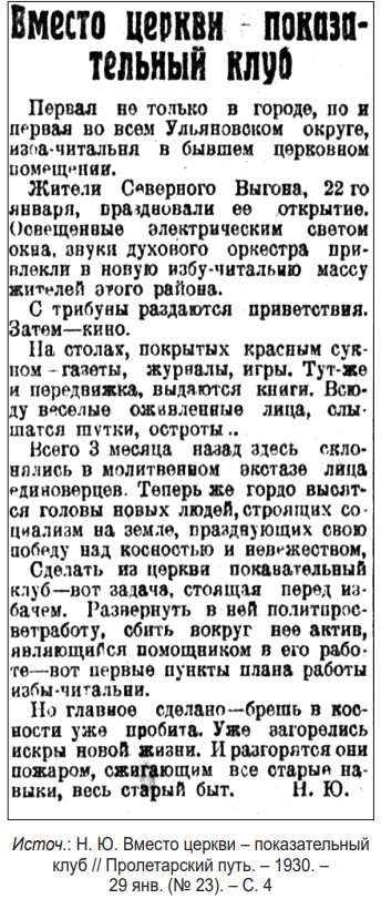 - см.: Н. Ю. Вместо церкви – показательный клуб : [об открытии в помещении бывшей церкви избы-читальни] // Пролетарский путь. – 1930. – 29 янв. (№ 23). – С. 4.