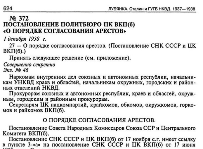 Разрешения на аресты членов и кандидатов в члены ВКП(б) органам давали первые, а в случае их отсутствия — вторые секретари районных, городских, окружных, краевых, или областных комитетов ВКП(б), или ЦК нацкомпартий. А в отношении коммунистов, занимавших руководящие должности в Наркоматах Союза ССР и приравненных к ним центральных учреждениях, или в отношении ответственных работников-коммунистов партийных, советских и хозяйственных учреждений требовалось согласие Секретариата ЦК ВКП(б).