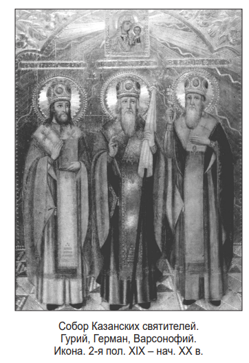 За правым клиросом в отдельном киоте вставлена икона святителя Германа, архиепископа Казанскаго, в серебряной, вызолоченной ризе и в серебряной рамке. Вокруг святителя изображены события из его жизни; все изображения в серебряных ризах, а венцы вызолоченные. Над самою иконою серебряное, вызолоченное сияние с изображением в нем Господа Саваофа. Икона эта замечательнакак своею древностью, так особенно святынею, в ней заключающеюся. В икону вложена часть святых мощей святителя Германа, в 1697 году, по разрешению Казанскаго митрополита Маркелла, присланных в Симбирск в благословение и благодатную помощь* (* Другая часть св. мощей святителя Германа находится в Симб. Кафедр. Соборе (Троицкий кафедральный собор. – В. Я.). См. в описании последняго).