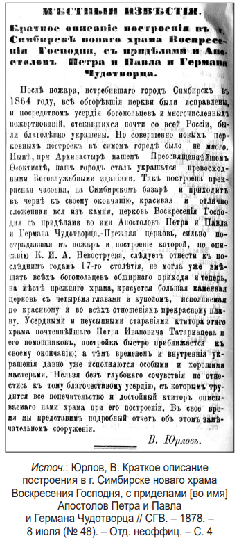 - см.: Юрлов, В. Краткое описание построенияв г. Симбирске новаго храма Воскресения Господня,с приделами [во имя] Апостолов Петра и Павла и Германа Чудотворца // СГВ. – 1878. – 8 июля (№ 48). –Отд. неоффиц. – С. 4.