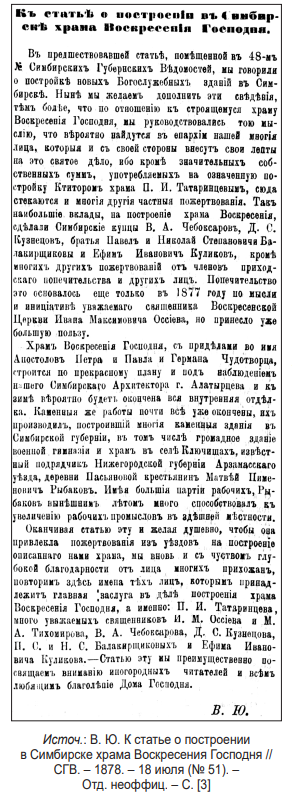 - см.: В. Ю. К статье о построении в Симбирске храма Воскресения Господня // СГВ. – 1878. – 18 июля(№ 51). – Отд. неоффиц. – С. [3].