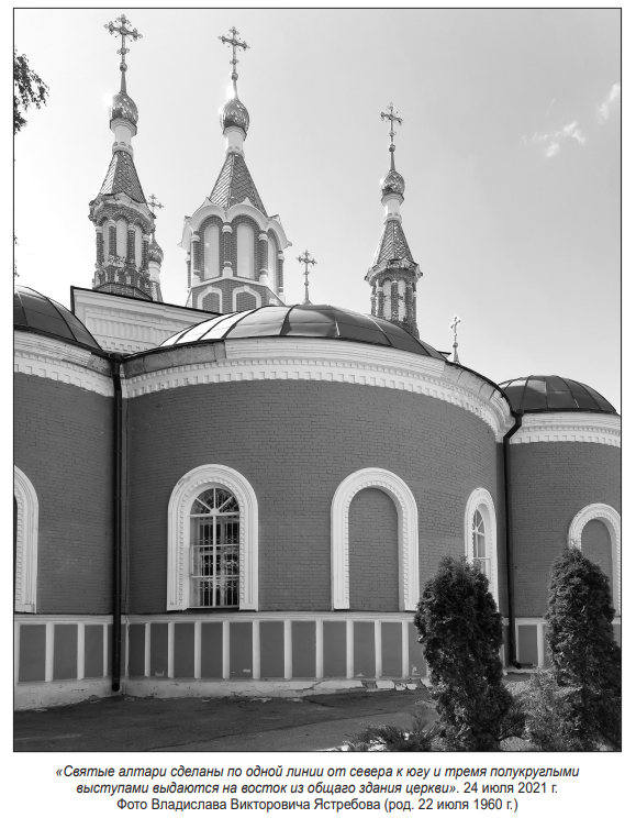 «Ветхая каменная колокольня была разрушена, два трапезных придела были упразднены, вырыт ров под фундамент, заготовлены первые нужные материалы, отслужен молебен. Щедрою рукою подавались пожертвования на церковь, и она скоро была воздвигнута в величественных, в сравнении с прежними, размерах. И внутренность, и внешность церкви существенно были изменены. Она устроена трехпрестольною. Святые алтари сделаны по одной линии от северак югу и тремя полукруглыми выступами выдаются на восток из общаго здания церкви.