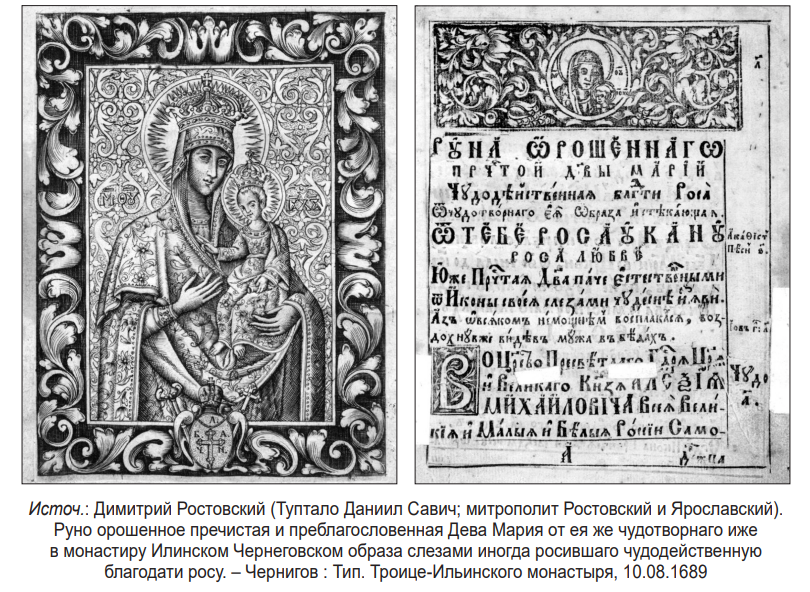 - см.: Димитрий Ростовский (Туптало Даниил Савич; митрополит Ростовский и Ярославский). Руно орошенное пречистая и преблагословенная Дева Мария от ея же чудотворнаго иже в монастиру Илинском Чернеговском образа слезами иногда росившаго чудодейственную благодати росу. – Чернигов : Тип. ТроицеИльинского монастыря, 10.08.1689.