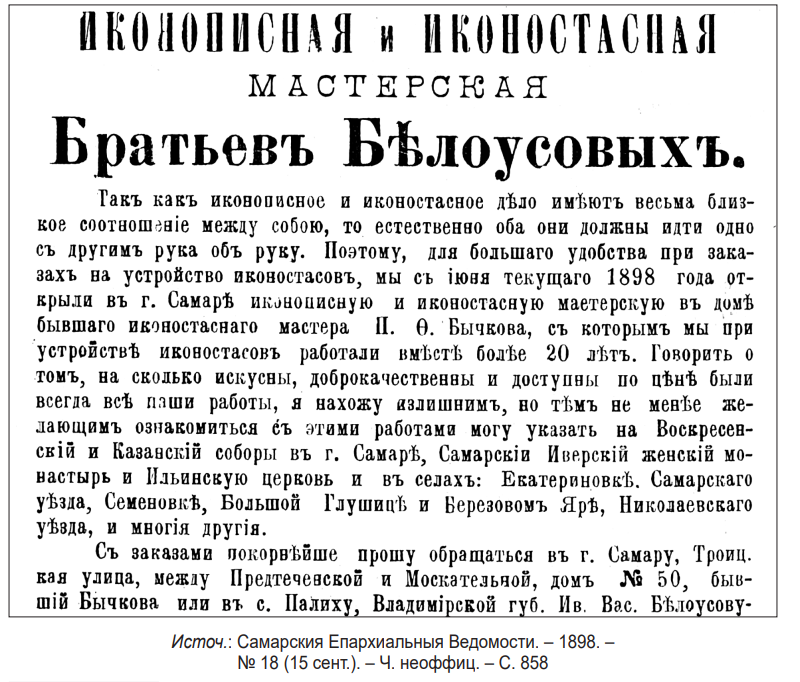 - Иван Васильевич Белоусов (1852–1914) вместе с братьями Василием Васильевичем (?–?) и МихаиломВасильевичем (?–?) в начале 1880‑х гг. открыл самостоятельную мастерскую в Палехе, а в 1898 г. в Самаре –иконописную и иконостасную мастерские. См.: Бакушинский, А. В. Искусство Палеха. – Москва ; Ленинград :Academia, 1934. – С. 98, 256.