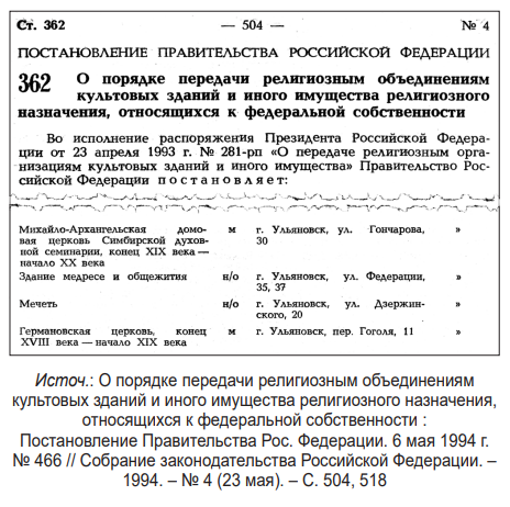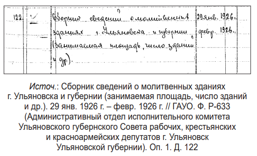 - см.: Сборник сведений о молитвенных зданиях г. Ульяновска и губернии (занимаемая площадь, числозданий и др.). 29 янв. 1926 г. – февр. 1926 г. // ГАУО. Ф. Р-633 (Административный отдел исполнительногокомитета Ульяновского губернского Совета рабочих, крестьянских и красноармейских депутатов г. УльяновскУльяновской губернии). Оп. 1. Д. 122. Л. 19.