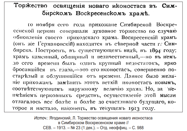 - см.: Ягодинский, Л. Торжество освящения новаго иконостаса в Симбирском Воскресенском храме //СЕВ. – 1913. – № 23 (1 дек.). – Отд. неоффиц. – С. 988, 989.