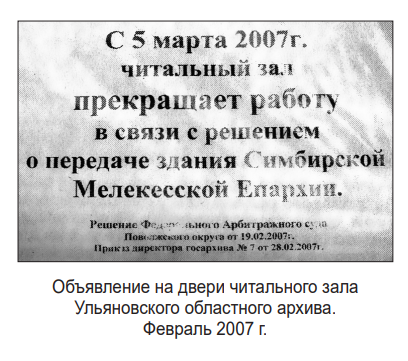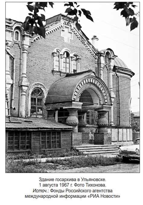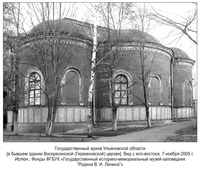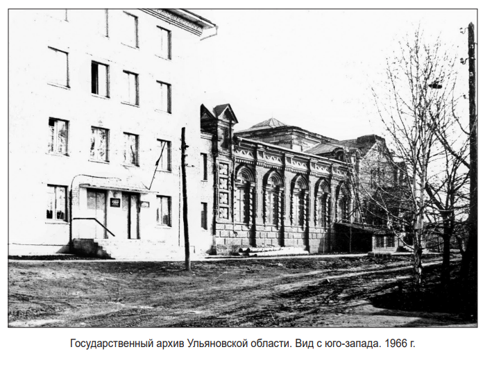 - В конце лета 1930 г. здание бывшей Симбирской духовной консистории (адрес: г. Ульяновск, ул. Труда, 21; было снесено в конце 1960‑х гг.), где ранее находился архив, было передано Мордовскому педтехникуму (см.: Выписка из постановления Президиума Ульяновского городского Совета о предоставлении Германовской церкви под городской архив и переписка о перемещении дел. 27 авг. 1930 г. – 31 дек. 1931 г. // ГАУО.Ф. Р-652 (ОГУ «Государственный архив Ульяновской области» Министерства искусства и культурной политикиУльяновской области, г. Ульяновск). Оп. 1. Д. 122. ЛЛ. 1–2).