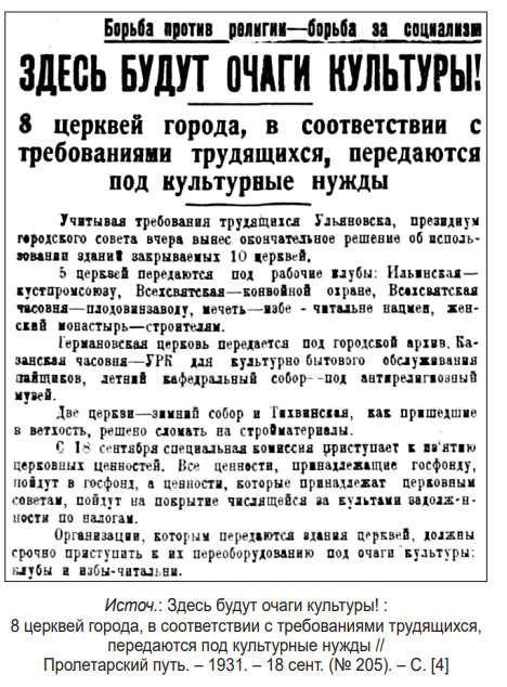 - см.: Материалы о снятии колоколов и закрытии церквей в г. Ульяновске (протоколы, выписки из протоколов, список церквей). 15 декабря 1929 г. – 3 июня 1930 г. // ГАУО. Ф. Р-634 (Исполнительный комитетУ льяновского городского Совета народных депутатов г. Ульяновск Ульяновской области). Оп. 1. Д. 278. Л. 66.