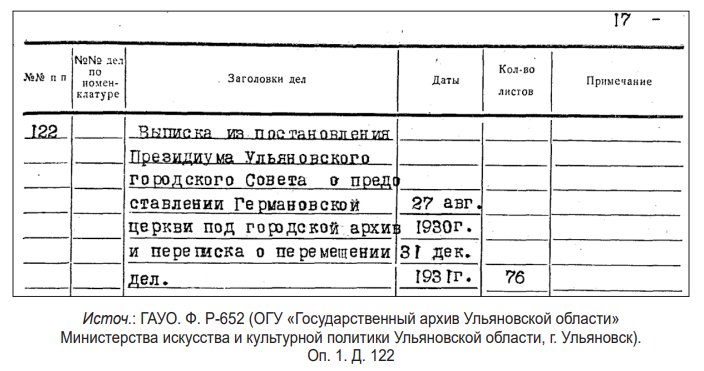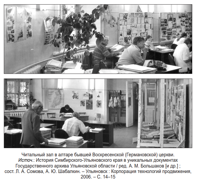 - см.: Выписка из постановления Президиума Ульяновского городского Совета о предоставлении Германовской церкви под городской архив и переписка о перемещении дел. 27 авг. 1930 г. – 31 дек. 1931 г. // ГАУО.Ф. Р-652 (ОГУ «Государственный архив Ульяновской области» Министерства искусства и культурной политикиУльяновской области, г. Ульяновск). Оп. 1. Д. 122. Л. 36. См. тж.: Здесь будут очаги культуры! : 8 церквей города, в соответствии с требованиями трудящихся, передаются под культурные нужды // Пролетарский путь. –1931. – 18 сент. (№ 205). – С. [4].