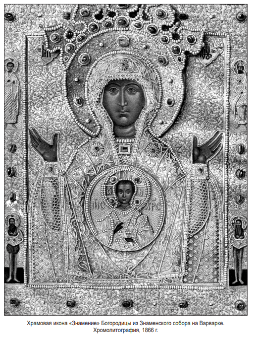 «Придельная Знаменская церковь и по сель остается внутри без всяких перемен и только была неоднократно подкрашиваема. До открытия Епархии в г. Симбирске (46) вход в эту церковь был с западной стороны под колокольнею, а с северной стороны была паперть и служила по временам также входом. С обращением главной церкви в теплую (в 1831 г. – В. Я.), оба эти входа закладены. Паперть с западной стороны, чрез которую проходили в трапезу церкви, обращена в сторожку, самая трапезная в ризницу. Вход в Знаменскую церковь сделан чрез приделанный к главной церкви каменный корридор, чрез который теперь входят как в главную Николаевскую церковь (47) , так и в знаменскую – в особые одна от другой двери. Олтарь сей церкви, на котором возвышается четверочастный с серпом крест, образует полукружие. Над царскими вратами, которыя с иконостасом вызолочены по местам, изображен седьмисвечник, а выше его скрижаль с херувимами, по правую сторону коих первосвященник Захарий, а по левую Давид с гуслями. По правую сторону царских врат, на коих изображено приведение во храм Преосв. Богородицы, стоит образ Нерукотвореннаго Спаса. Образ сей темнаго греческаго письма, поставлен здесь в память образа некогда стоявшаго на Кремлевских вратах стараго города Симбирска <…> Среди церкви есть арка, на южной стороне которой висит образ Живоначальныя Троицы в виде 3‑х Ангелов древняго иконнаго писания и образ Св. Дмитрия Ростовскаго Чудотворца с краткою внизу биографиею. На южной стороне арки висит образ, темнаго греческаго письма, Божией Матери Живоноснаго Источника с двумя Ангелами. Под аркою висит древнее небольшое паникадило» (48) .