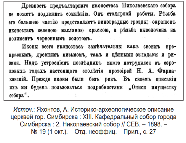 - см.: Яхонтов, А. Историко-археологическое описание церквей гор. Симбирска : XIII. Кафедральный соборгорода Симбирска : 2. Николаевский собор // СЕВ. – 1898. – № 19 (1 окт.). – Отд. неоффиц. – Прил., с. 30, 26.