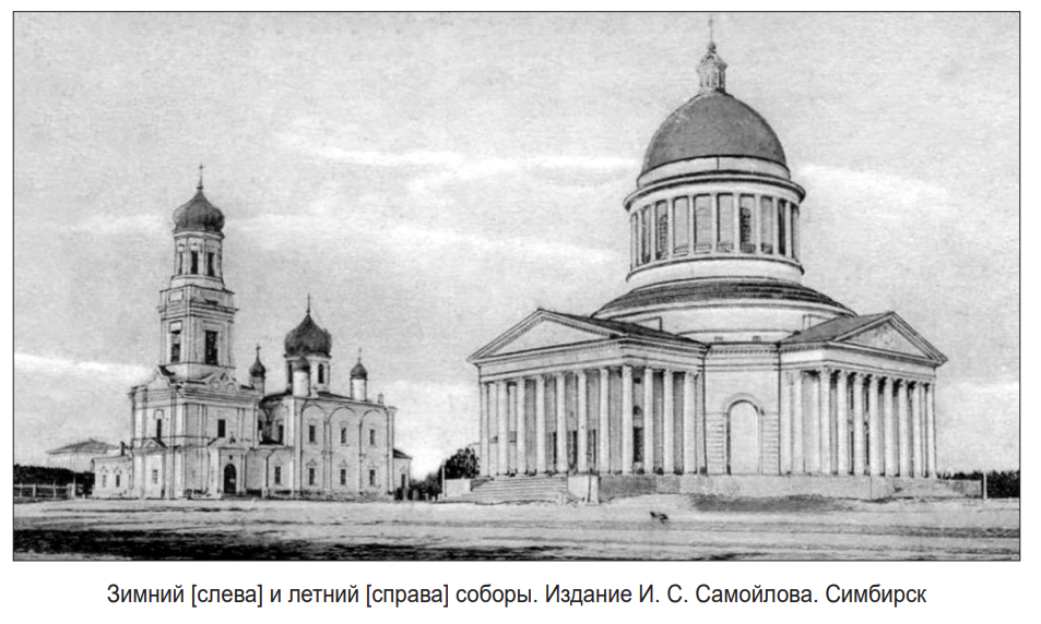 «Кто был основателем сего собора, ничего нельзя сказать по недостатку положительных сведений. Можно думать, что он был построен иждивением церкви любивых граждан при Августейшем содействии Государя Петра I‑го, Который соревновал своему августейшему Отцу, а формою мог служить прежний деревянный <…> Наружный вид собора доселе остался тот же, исключая малых пристроек, последовавших в позднейшее время. Длина главнаго храма – 12 сажен (ок. 25,6 м. – В. Я.), а с папертью впоследствии пристроенною 13½ с. (ок. 28,8 м. – В. Я.), ширина – 7 сажен (ок. 14,9 м. – В. Я.). В приделе Знамения Божией Матери 10 саж. (ок. 21,3 м. – В. Я.) длин. и 4 с. (ок. 8,5 м. – В. Я.) ширины, стены храма – два аршина (ок. 1,4 м. – В. Я.). Церковь покрыта была деревянною четырехскатною крышею, и уже в позднее время вместо деревянной – железною. Над главным квадратным храмом возвышается пять фонарей с грушеобразными главами и четверочастными Крестами, исключая большаго, средняго, который с Крестом шестерочастным. По углам храма четыре фонаря глухие, безоконные и по объему меньше средняго, который с длинноузкими окнами. Свет, входя в эти окна, освещал верхнюю часть внутренняго Храма. При первом Архипастыре – Симбирском Преосвященнейшем Анатолии внутренность большаго, средняго фонаря закрыта была круглою, деревянною о стеклами рамою. При 2‑м Архипастыре Преосвященном Феодотии рама со стеклами была уничтожена, а вместо оной сделан подобно своду деревянный, подвесной потолок, окрашенный бирюзовою масленоюкраскою с разведенными по нему облаками; среди потолка утвержденаполуторааршинная (ок. 1 м. – В. Я.) рама с разноцветными стеклами. Главный Олтарь во имя Живоначальной Троицы сделан полукружием, совмещающим в себе три малыя полукружия. Под передним, за деланным в позднее время, окном олтаря, находится вырезная на алебастре надпись, потерпевшая много изменений современи ея открытия, и потому теперь мало слов доступно для чтения. С южной стороны была дверь и крыльцо; но в 1837 г. перед приездом Государя Цесаревича Александра Николаевича эта дверь была закладена. Стены храма со всех сторон выложены кругообразными с пьедесталами карнизами двухъярусными по углам и меж окон полуколоннами. Окна, которые, по высоте церковнаго здания, сделаны в два яруса, и между которыми находится пояс, снаружи украшен выкладными наличниками. Под церковию, с открытия Наместничества (16) в г. Симбирске и присутственных мест хранились в подвале казенныя деньги, и уже в не совсем древнее время перенесены в устроенное для сего Казначейство» (17).