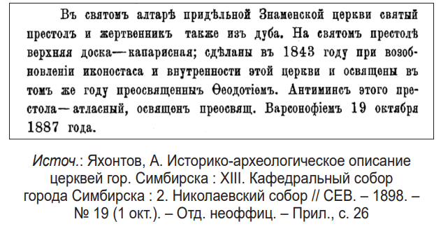 - см.: С. В. Освящение придельнаго храма в честь иконы Знамения Божией Матери в Симбирском тепломКафедральном соборе // СЕВ. – 1899. – № 2 (15 янв.). – Отд. неоффиц. – С. 111.