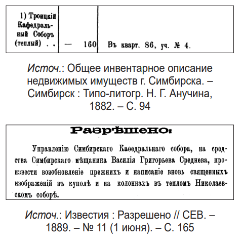 - В тексте: «Троицкий Кафедральный Собор (теплый)…». Источ.: Общее инвентарное описание недвижимых имуществ г. Симбирска. – Симбирск : Типо-литогр. Н. Г. Анучина, 1882. – С. 94.
