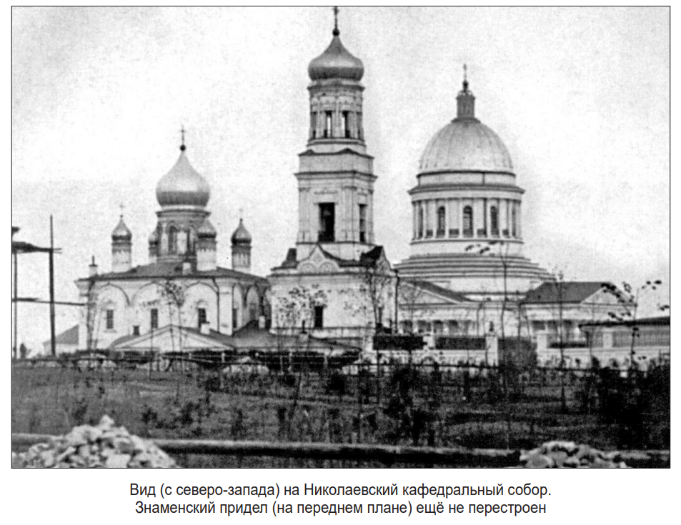 «9 мая (1897 г. – В. Я.) – (пятница, день перенесения мощей Святителя и Чудотворца Николая) Преосв. Никандром совершены были торжественное освящение начала работ и закладка новаго боковаго придела (с северной стороны), более обширнаго, вместо прежняго, очень теснаго, примыкающаго к зимнему кафедральному собору. Расширением означеннаго придела имеется в виду увеличить размеры соборнаго храма, так, чтобы он свободно вмещал в зимнее время молящихся в великие праздники и в высокоторжественные дни, когда народу является на богослужение (обычно совершаемое архиерейским служением) особенно много. Средняя часть храма примкнет и непосредственно соединится с новым приделом чрез разборку старой северной стены собора в форме арок.