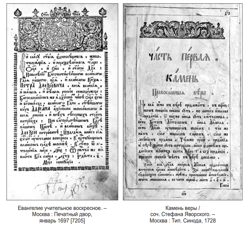 «Книги все Духовнаго содержания. Из древних по изданию можнотолько на две указать, именно: на Евангелие учительное Воскресное –печат. 1693 года (69) и на Камень Веры 1713 года (70)» (71).