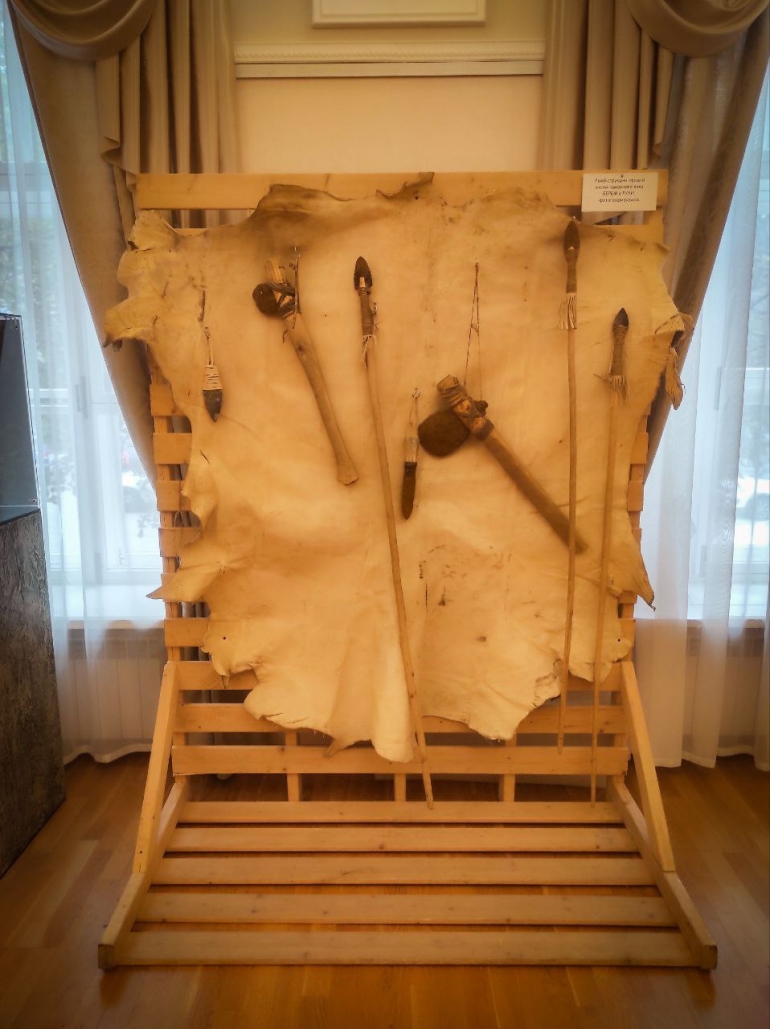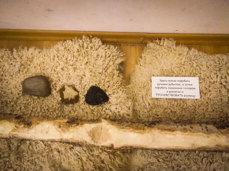 В зале музея посетители могут буквально примерить роль древнего человека — метнуть динамически закрепленное копье прямо в цель, выпустить стрелу из арбалета, которая пролетит по специальной пластиковой трубе, попробовать продолбить бревно каменным топором.