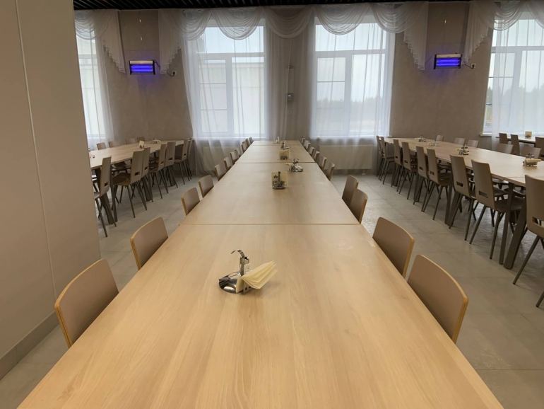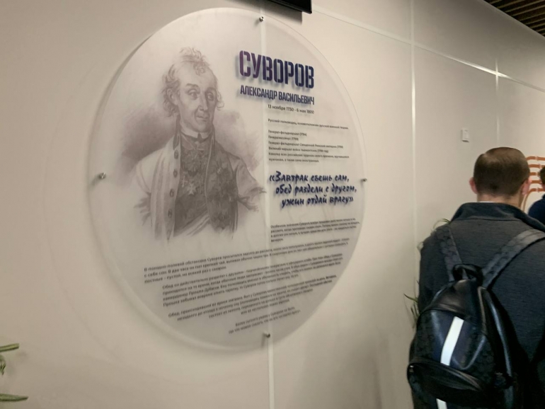 Перед входом в столовую висит большой стеклянный стенд с изображением великого русского полководца и его бессмертным изречением: «Завтрак съешь сам, обедом поделись с товарищем, а ужин отдай врагу».