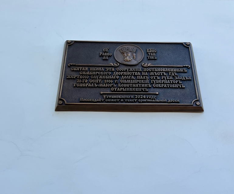 Как сообщили в Симбирской епархии, мемориальную доску установили в память убиенного губернатора, генерал-майора Константина Сократовича Старынкевича.