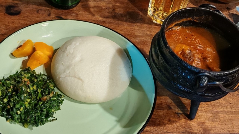 «Это локальное блюдо Зимбабве — Тарелка охотника. В горшочке гуляш из мяса антилопы куду. Он подаётся с кашей садза и жареной зеленью. Садза — базовая традиционная каша из кукурузной муки. Цена — 18 долларов».