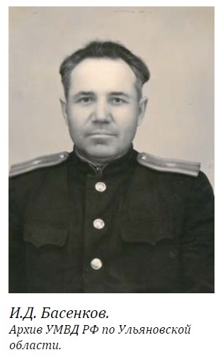 2 марта 1943 г. Басенкова откомандировали на службу в милицию в только что организованную Ульяновскую область, где уже через несколько дней – 11 марта – его назначили начальником милиции Стромайнского районного отдела НКВД. С августа 1944 октябрь 1947 г. Басенков служил заместителем начальника Астрадамовского РО НКВД, приняв активное участие в ликвидации банды некоего Васильева, который был убит в перестрелке в январе 1945 г. Затем работал начальником Чердаклинского РОВД и 1 января 1959 г. уволен в запас и на пенсию по выслуге лет (Архив УМВД по Ульяновской области. Личное дело №4877).
