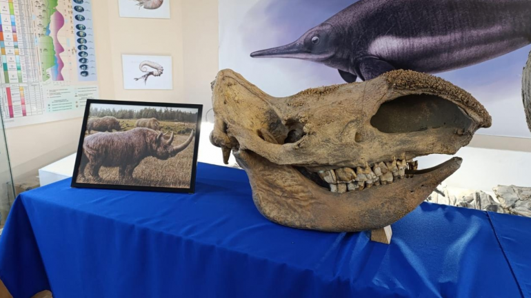 Это череп с сохранившимся роговым покровом рогов ископаемого бизона, проживавшего 2,5 - 0,7 миллионов лет назад, и нижняя челюсть шерстистого носорога, исчезнувшего 14 - 8 тысяч лет назад. Череп этой же особи уже есть в коллекции музея.