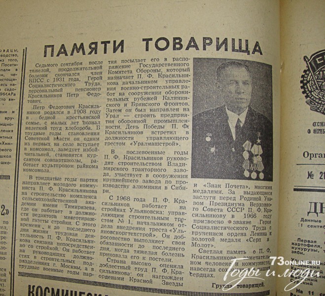 Седьмого сентября после тяжелой продолжительной болезни скончался член КПСС с 1931 года, Герой Социалистического Труда, персональный пенсионер Красильников Петр Федотович (…)