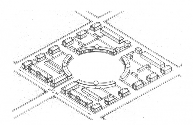"Самым занимательным местом должна была стать центральная площадь губернского Симбирска, разбитая на месте разобранного кремля. Обширная, абсолютно круглая, окружённая крытыми торговыми галереями и расположенная среди административно-торгового квартала, в комплекс которого входили внушительные генерал-губернаторский, губернаторский и вице-губернаторский дома, здание присутственных мест и домики для разных учреждений. Но проект, хотя и утверждённый планом 1780 года, не «выгорел», оказавшись, по мнению известного советского историка архитектуры Сергея Ожегова, «архаичным и отвлечённо схематичным», когда «функционально ненужная грандиозная площадь доминировала над мелкими формами окружавших её строений»".