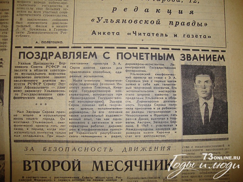 Указом Президиума Верховного Совета РСФСР за заслуги в области советского музыкального искусства присвоено почетное звание заслуженного деятеля искусств РСФСР Серову Эдуарду Афанасьевичу – главному дирижеру Ульяновского Государственного симфонического оркестра (…)