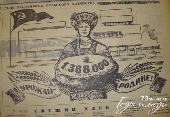 (…) Нынче, в 1973-м, колхозы и совхозы области собрали по 24,5 центнера зерна с гектара и 13 октября продали государству 1 миллион 368 тысяч тонн хлеба. А в ближайшие дни будут завершены повышенные социалистические обязательства и количество сданного государству хлеба достигнет 1 миллиона 470 тысяч тонн.