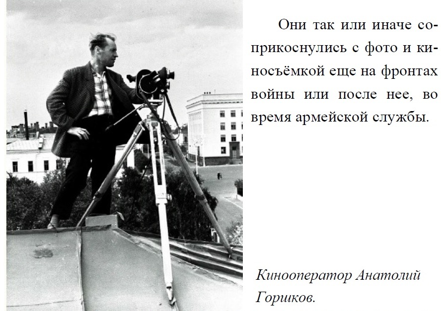 Первыми кинооператорами были участники Великой Отечественной войны Енюткин (имя забыто. – Авт.), Анатолий Горшков, Николай Егоров. Они так или иначе соприкоснулись с фото и киносъёмкой еще на фронтах войны или после нее, во время армейской службы.