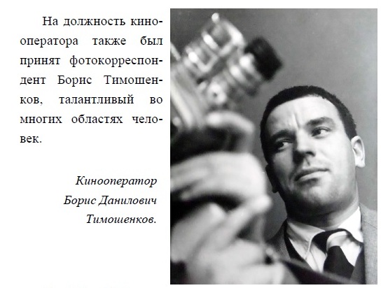 На должность кинооператора также был принят фотокорреспондент Борис Тимошенков, талантливый во многих областях человек.