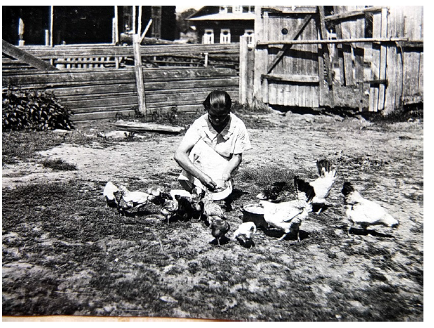 Мама всецело посвятила себя домашнему хозяйству. Завела кур, гусей, козу, а впоследствии корову Динку. Кошка Мурка и собачка Шпулька пользовались любовью всех членов нашей семьи. В огороде на грядках росли лук, свекла, морковь, турнепс, репа, картошка, горох, бобы. Мы, дети, поливали их, при этом бобы и горох ели с удовольствием. Мама моя не делала никакой разницы между мной и сестрой, относилась к ней как к родной. Мне, правда, как младшему, заботы доставалось больше, ни одно чихание не оставалось без внимания.