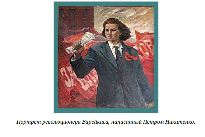 На ней был выставлен портрет известного революционера Варейкиса, в годы Гражданской войны он был комендантом Симбирска. Это очень сильная и качественная работа, Варейкис был изображен на фоне красного знамени с газетой с воззванием «К гражданам России» в руке. Художник выразил характер той эпохи — напряженная поза, как будто рвущаяся к светлому будущему. Колорит картины, преобладание красного, подчеркивает то пылающее горячее время.