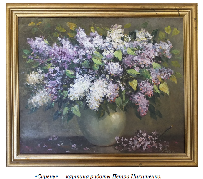 Петр Никитенко любил и умел, как никто, писать цветы — они у него выглядят живыми, только что срезанными, поставленными в вазу с прозрачной водой, словно хранящими пьянящие ароматы приволжских лугов. Рисуя букет, он умел оживить картину, обратив внимание на какую-то деталь — оставленную рядом с букетом, на столе, веточку сирени, на упавший лепесток розы. Сирень он обожал, она окружала дом его мамы. Кусты ее повсюду растут на волжском косогоре. В мае, когда они расцветали, он приносил букеты в мастерскую и писал, писал их в разных вариантах. Картины с сиренью хорошо покупались в художественном салоне.