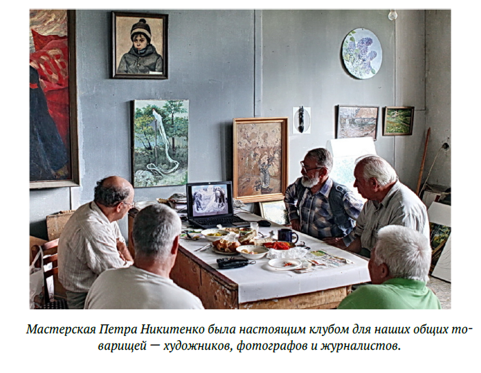 Для моих родных Никитенко был семейным художником. Портреты, пейзажи и натюрморты, подаренные им, висят в квартирах моих детей и внуков в Ульяновске, Москве, Санкт-Петербурге. Есть работы Петра даже в Париже, у его и моего друга фотографа Ари. Мастерская Петра была настоящим клубом для наших общих товарищей — художников, фотографов и журналистов.